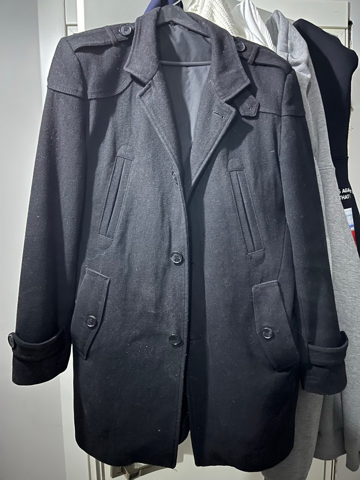 Düğmeli, gri renkte, normal boy midi uzunluğunda erkek kaban. Yumuşak kumaştan, dik yaka ve uzun kollu, ofis ve gündelik kullanıma uygun.