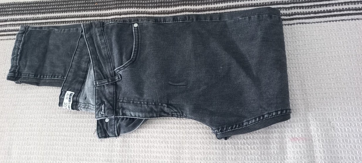 Düğmeli detaylara sahip, gri renkli, midi boy, dar kesim kadın kot pantolon. Günlük sokak stili için uygun.