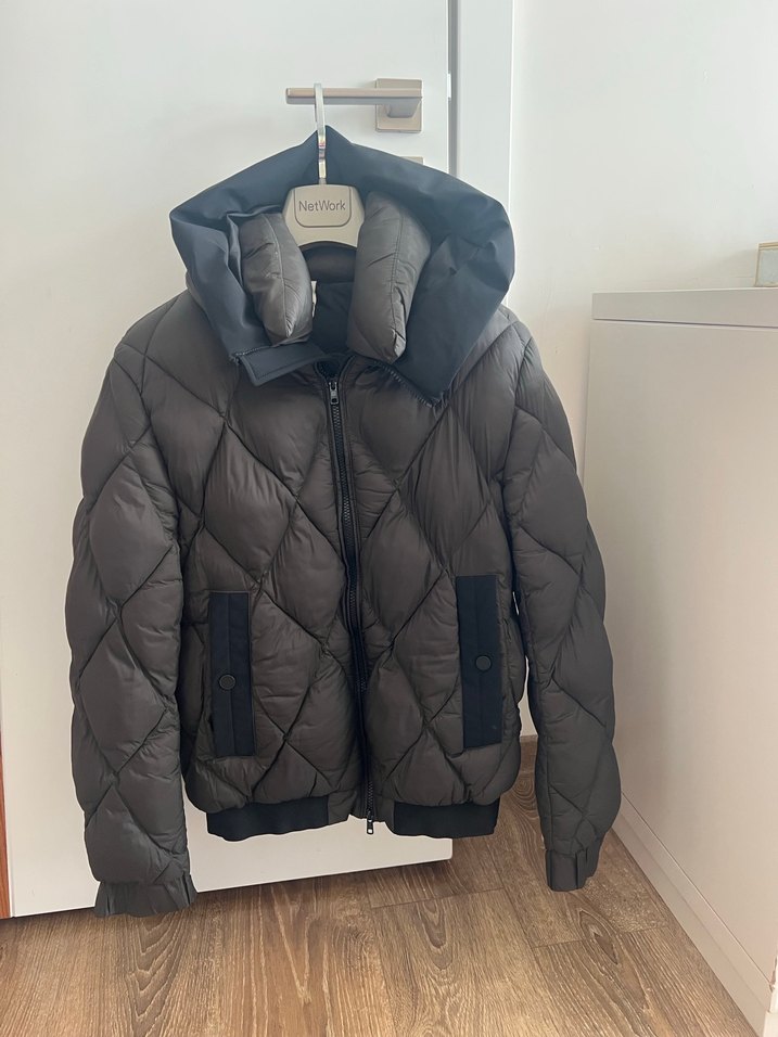 Düğmeli cepleri ve fermuarlı kapamasıyla gri, fitted kesim erkek midi mont. Uzun kollu ve yüksek yakalı, günlük kullanım için rahat ve sıcak tutar.