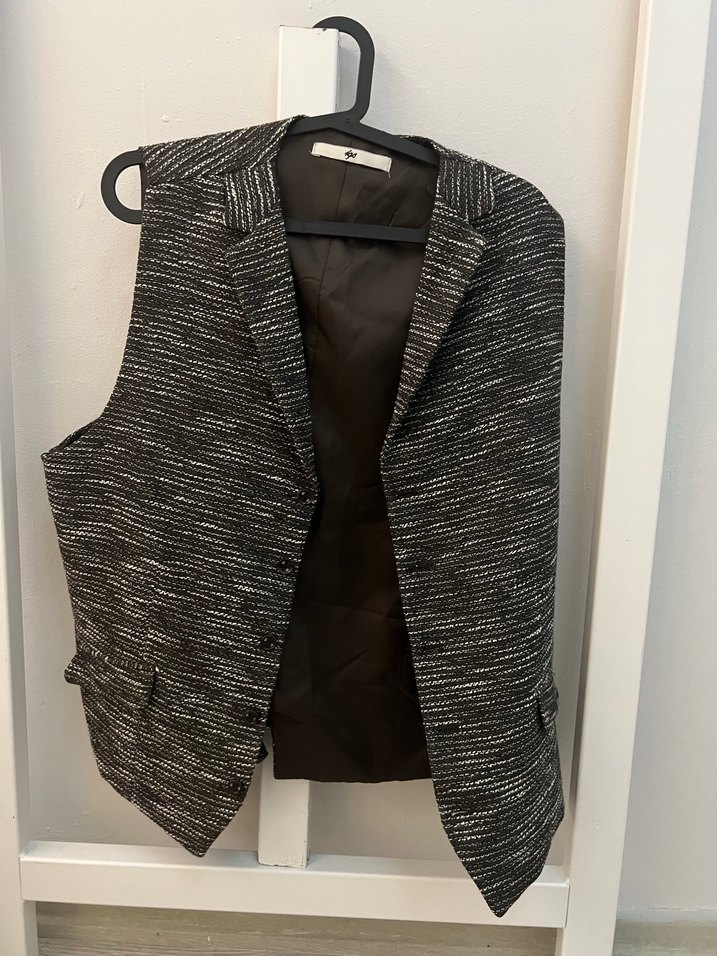 Düğmeli, notched lapel detaylı gri midi yelek, regular fit ve kolsuz. Sentetik kumaştan, ofis ve günlük kullanıma uygun.