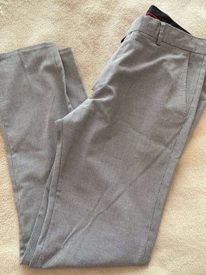 Düğmeli detaylı, düz gri erkek pantolon. Normal boy ve sentetik kumaştan, ofis ve sokak stili için uygun.