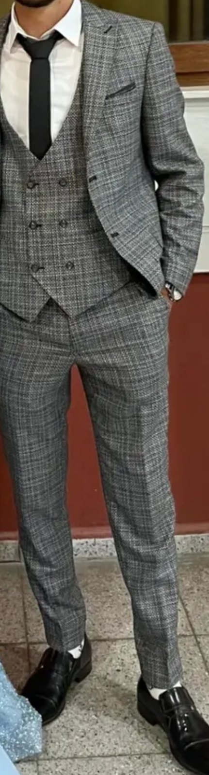Düğmeli, normal boy gri erkek pantolon. Sentetik kumaştan, ofis ve sokak tarzına uygun, rahat kesim.bir kere giyildi gömlek pantolon yelek kiravat hepsi içinde