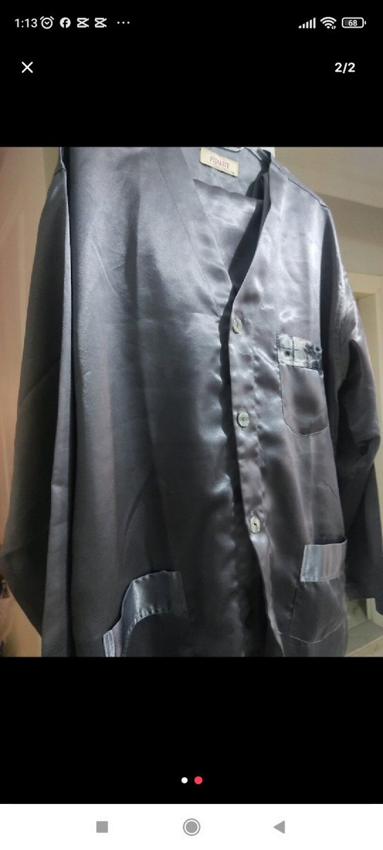 Düğmeli, notched lapel yakalı, uzun kollu gri erkek pijama üstü. Normal boyda, düz ve rahat kesimlidir.