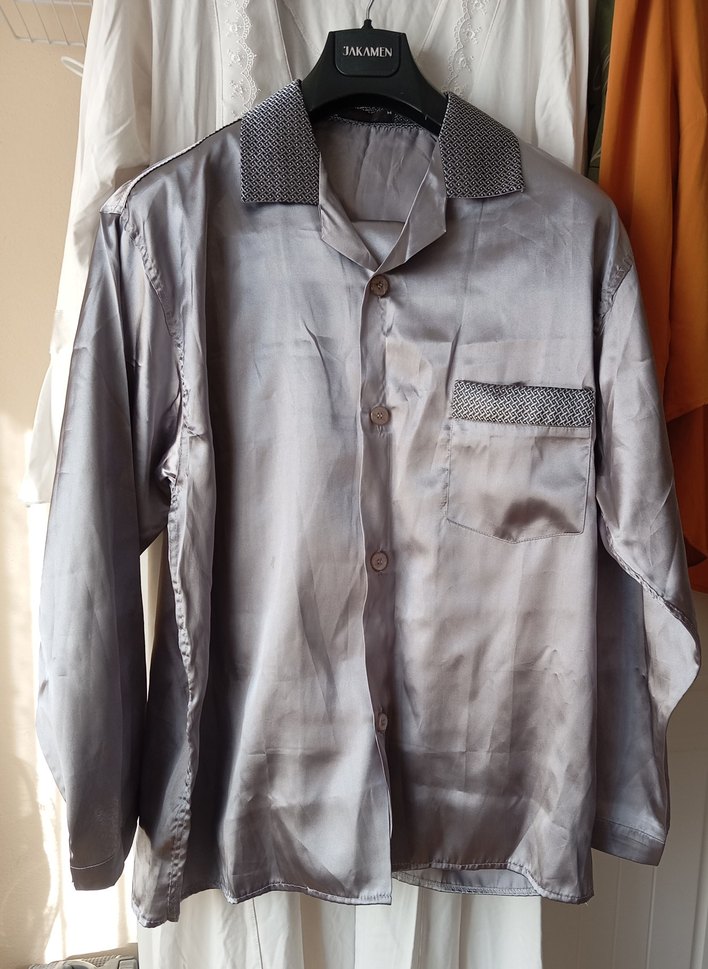 Gri renkte, uzun kollu, düğmeli ve yakası kesimli erkek pijama üstü. Göğüs cebinde detay bulunur, vintage streetwear tarzına uygundur.