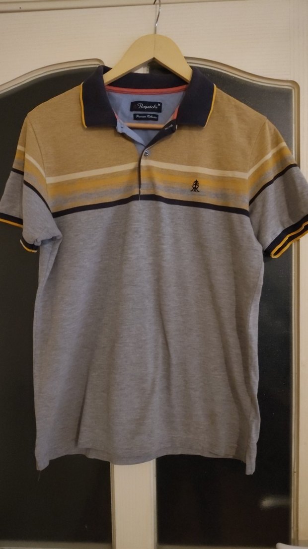 Düğmeli yakalı, kısa kollu, gri renkli ve baskılı şeritlere sahip, pamuk kumaştan yapılmış, günlük kullanıma uygun erkek polo tişörtü. 2 kol alti 62 cm.