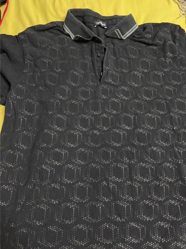 Düğmeli yakalı, kısa kollu ve vücuda oturan gri erkek polo tişört. Sentetik kumaştan, hafif geometrik desenli ve normal midi boyda. Günlük sokak stiline uygun. Bi kaç kere giyildi