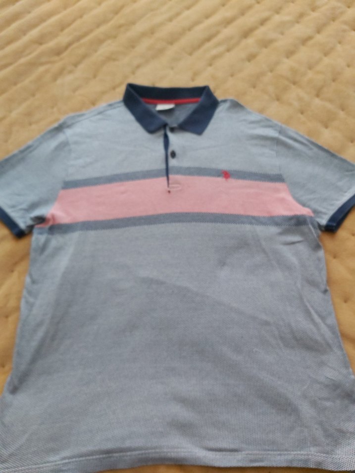 Kısa kollu, düğmeli yaka ve baskılı yatay şerit deseni olan pamuk erkek polo tişört. Rahat kesim, normal boy, günlük sokak tarzına uygun.