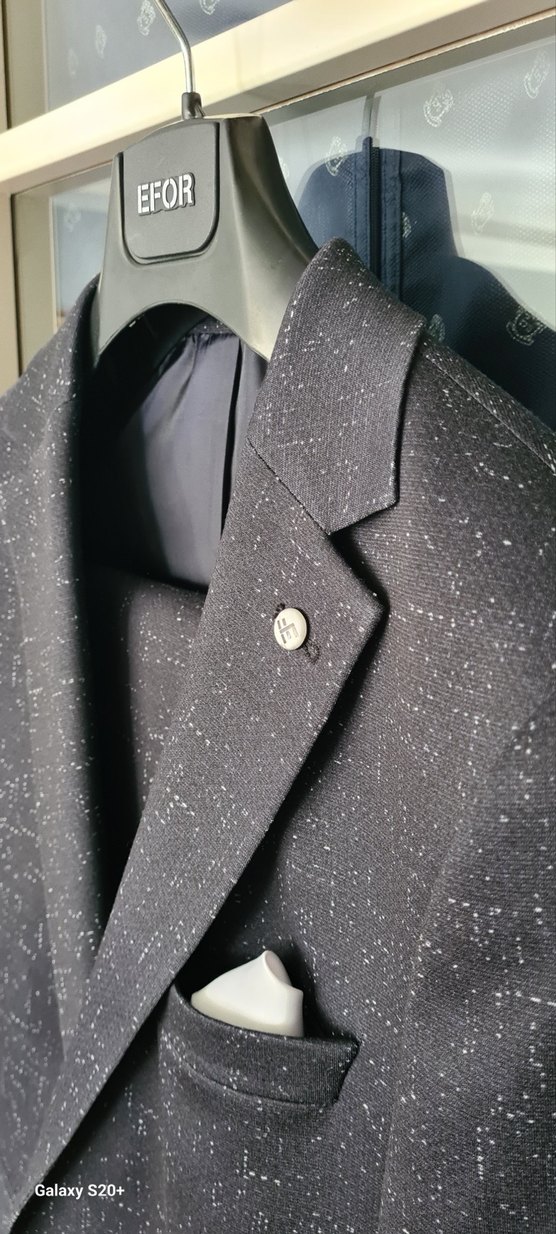 Düğmeli, çentikli yaka ve uzun kollu gri erkek takım elbise. Regular fit kesimi ve modern klasik tarzıyla iş ortamına uygundur. Kumaşında hafif benekli doku bulunur. 44/6 drop