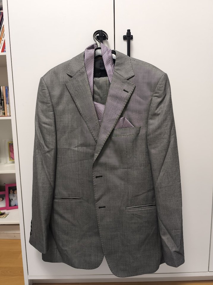 Düğmeli önü ve kırçıllı gri rengi ile klasik zarafette, modern klasik tarzda, uzun kollu erkek takım elbisesi. Ofis kullanımına uygundur.
