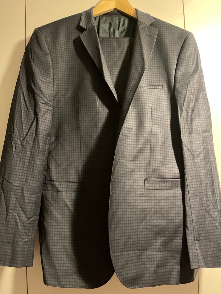 Düğmeli ön kısmı ve klasik yaka detayı olan gri erkek takım elbise ceketi, uzun kollu ve normal boyda, iş ortamları için uygundur. ️ ölcüleri daraltıma yaptırmış olabilirim lğtfen ölcüleri sorunuz