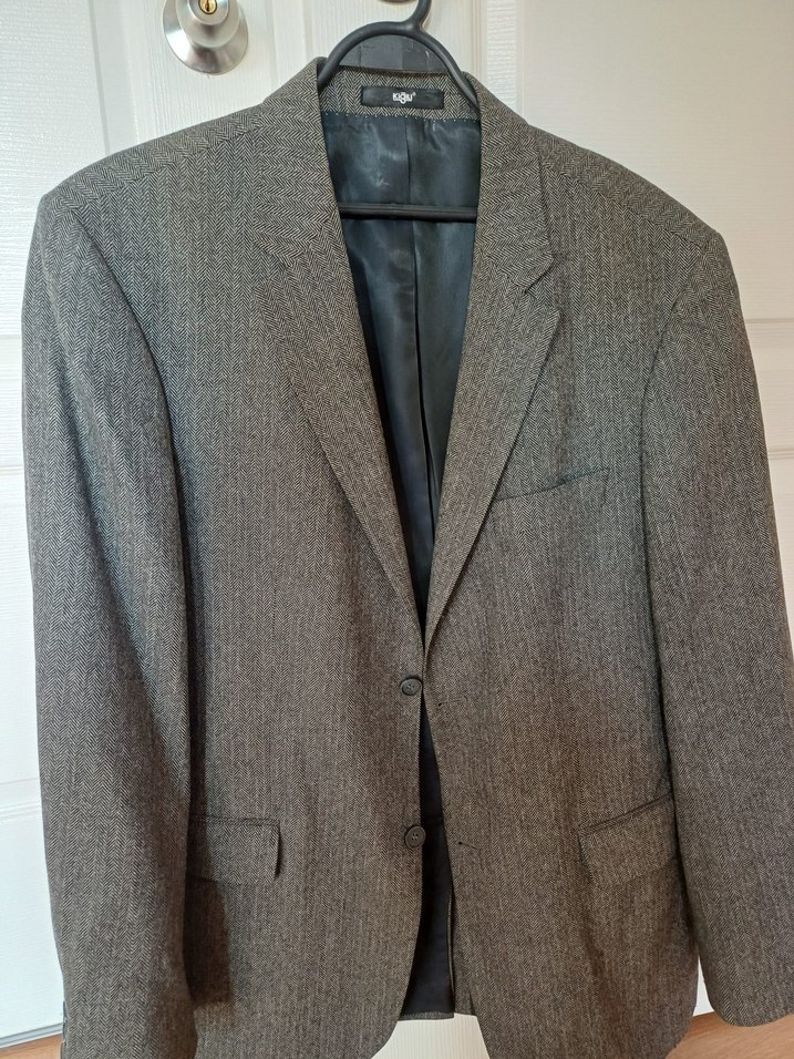 Gri renkli erkek takım elbisesi ceketi, düğmeli ve klasik kesimdir. Uzun kollu, normal boyda, ofis kullanımı için uygundur. Desensiz ve sade tasarıma sahiptir. beden 56/6