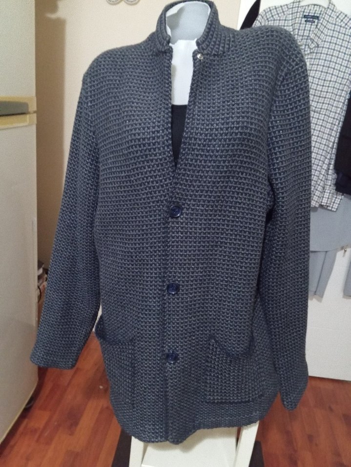 doğru dürüst kullanılmadı Düğmeli, gri renkli erkek triko hırka. Notch yaka, uzun kollu ve normal kesimdir. Günlük kullanıma uygundur.