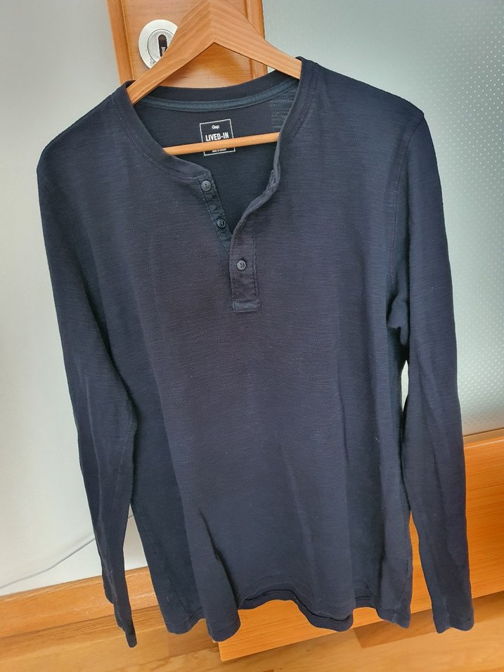 Düğmeli ön kısmı ve yuvarlak yakası olan koyu gri uzun kollu erkek sweatshirtü. Yumuşak denim kumaştan, bol kesim ve normal boyda, günlük rahat kullanım için uygundur.