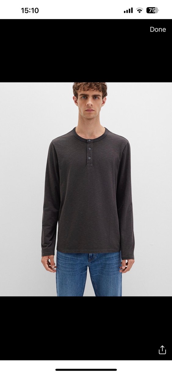 Düğmeli ön detaylı, uzun kollu gri erkek tişörtü. Denim kumaştan, regular fit ve günlük rahat kullanım için uygun. Antrasit renkli dökümlü sıfır etiketli ürün