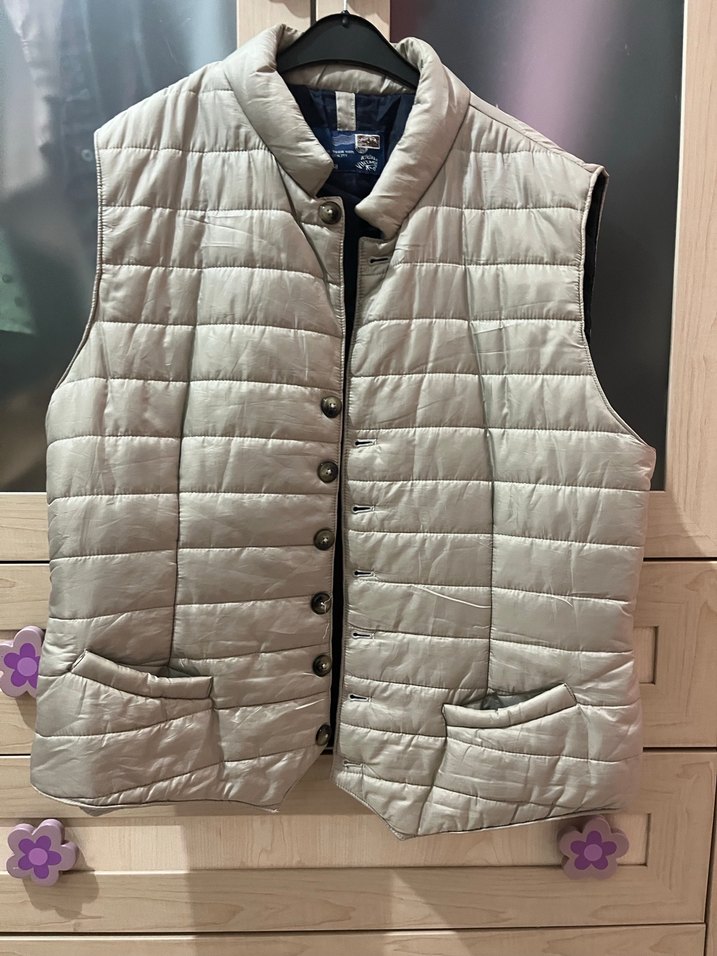 Gri renkte, keten kumaştan yapılmış, düğmeli, kolsuz ve kesik yaka detaylı kadın yelek. Normal uzunlukta, rahat kesim ve günlük sokak stiline uygun. İki cep bulunur.