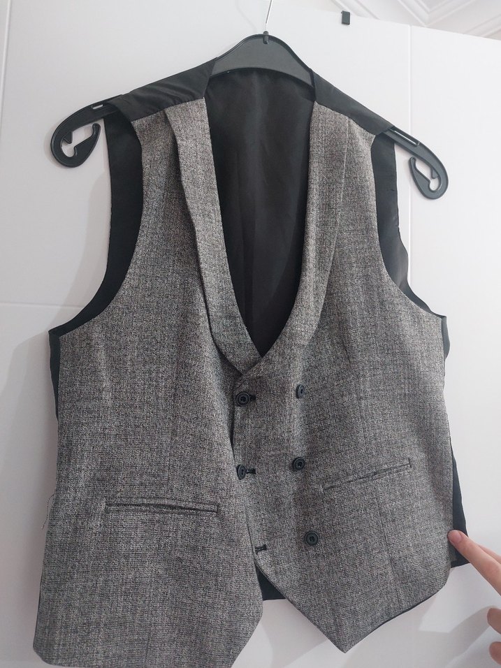 Düğmeli, kolsuz erkek yelek, notlu yakalı ve sentetik kumaştan imal edilmiştir. Gri renkte, midi boyda ve ofis ile sokak stiline uygundur. arkadan ayarlanışabilir kemerli