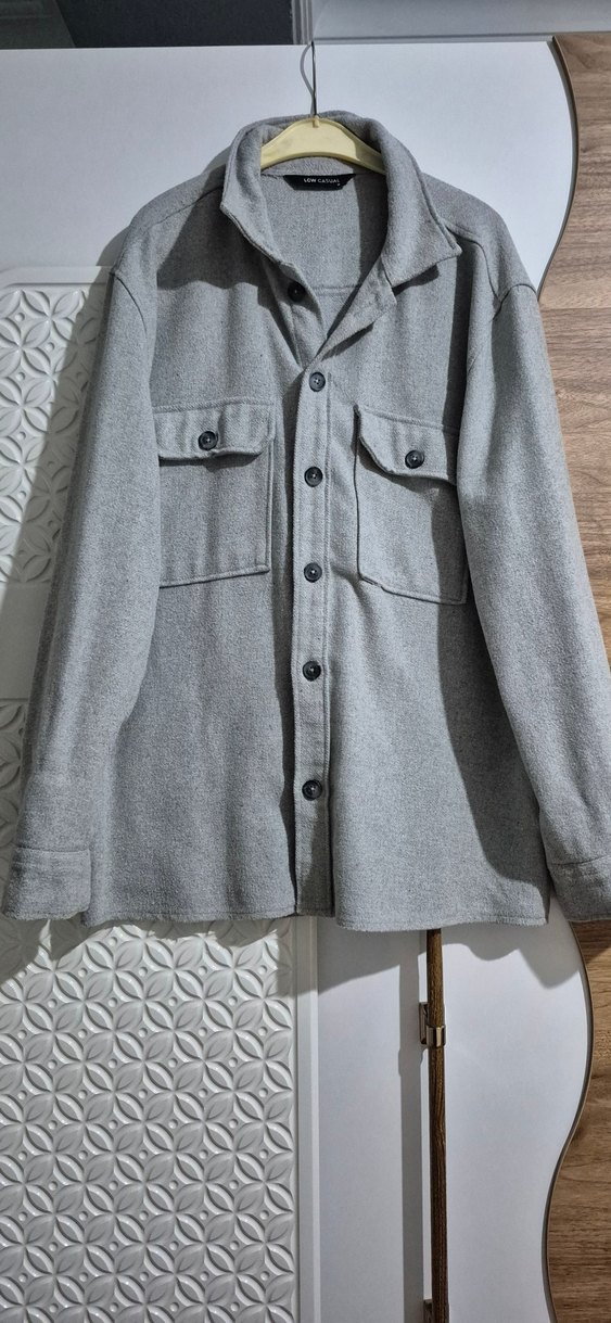 Düğmeli önü ve yakası kesik detaylı, yumuşak yün kumaştan yapılmış gri erkek ceket. Normal kesim, uzun kollu ve iki cep detaylıdır.