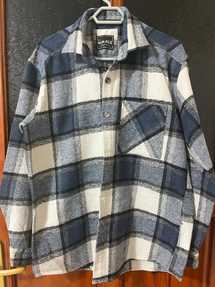 Düğmeli ve cep detaylı, yün kumaştan yapılmış gri kareli uzun kollu erkek gömlek. Rahat kesimli ve günlük kullanım için uygundur.