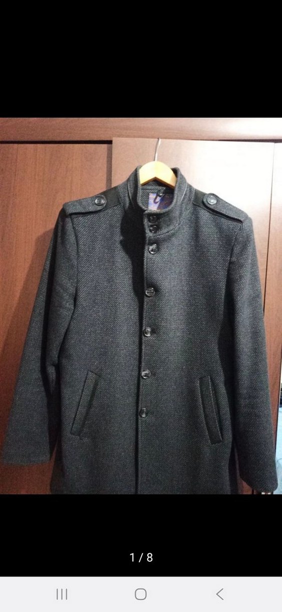 Düğmeli ön yüzü ve uzun kollu gri erkek yün kaban. Normal boy midi uzunlukta, klasik kesim ve notched yaka detayı ile sokak tarzına uygun.