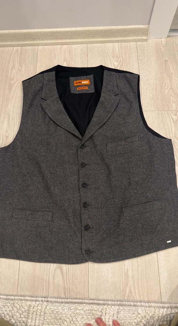 Düğmeli, gri yün yelek, kesik yaka ve normal kesimle günlük kullanıma uygun. boy ;60 cm en :55 cm 56 beden