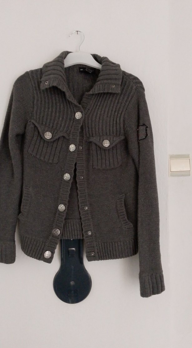 Düğmeli, uzun kollu, gri fitilli hırka. Yumuşak yünden üretilmiş, notched lapel yakalı, günlük kullanıma uygun rahat bir sokak stili sunar.