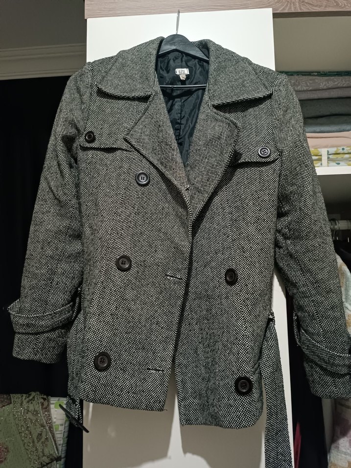 Gri renkte, çift düğmeli, geniş yakalı ve manşet detaylı kaban. Dokulu kumaş ve yan cepler bulunur. M beden Aynen fotoğrafta göründüğü gibidir