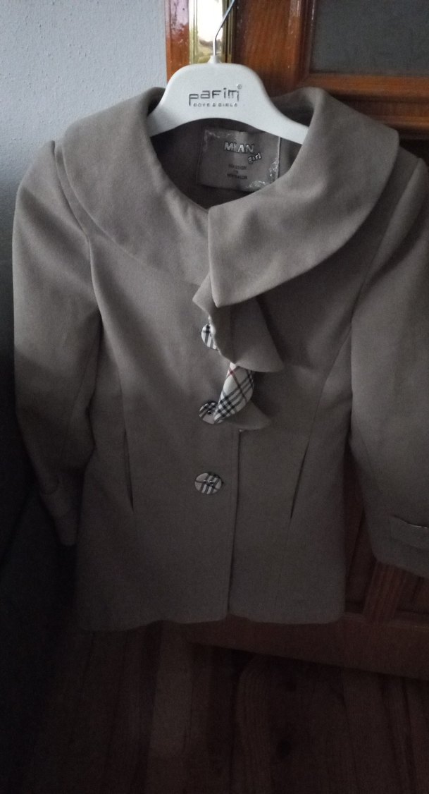 Geniş yakalı, desenli düğmeli gri kaban. Yumuşak ve sıcak kumaştan yapılmıştır.