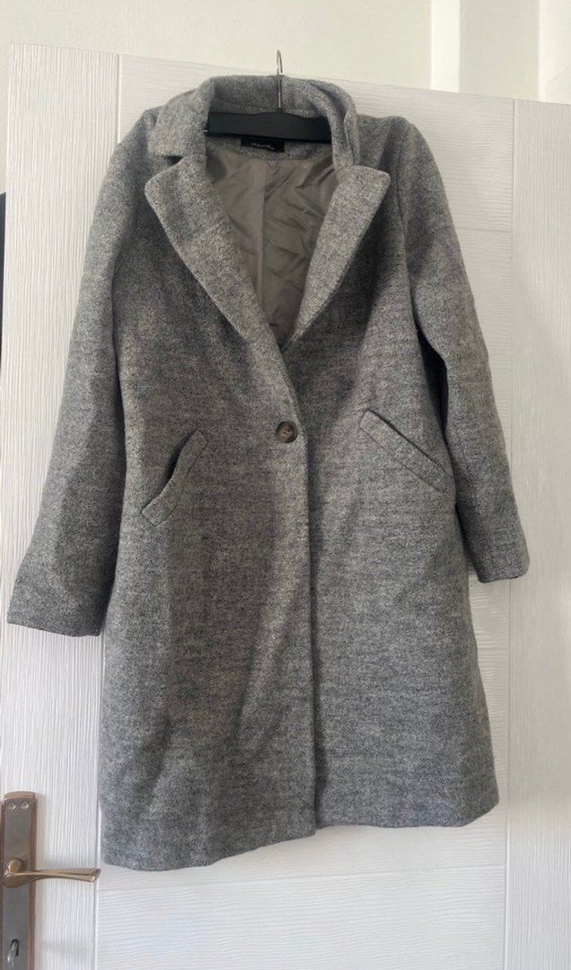 Yumuşak dokulu, düğmeli gri kaban. İki ön cepli, klasik yaka ve sıcak astarlı.