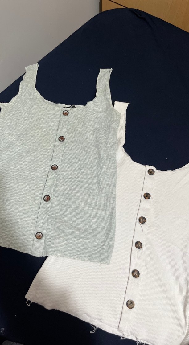 Yumuşak pamuktan yapılmış düğmeli, gri renkli askısız kadın atlet. Sade ve vücuda oturan midi boyda, günlük sokak stiline uygun.