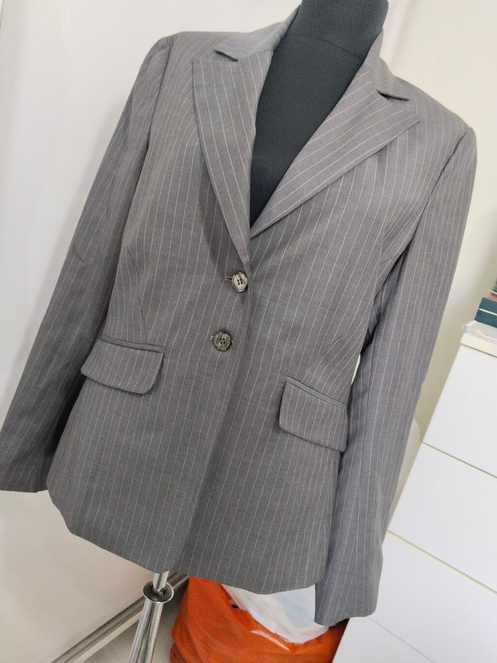 Düğmeli, uzun kollu ve klasik kesime sahip gri kadın blazer ceket. Ofis ve günlük kullanıma uygun, sentetik kumaştan üretilmiştir.