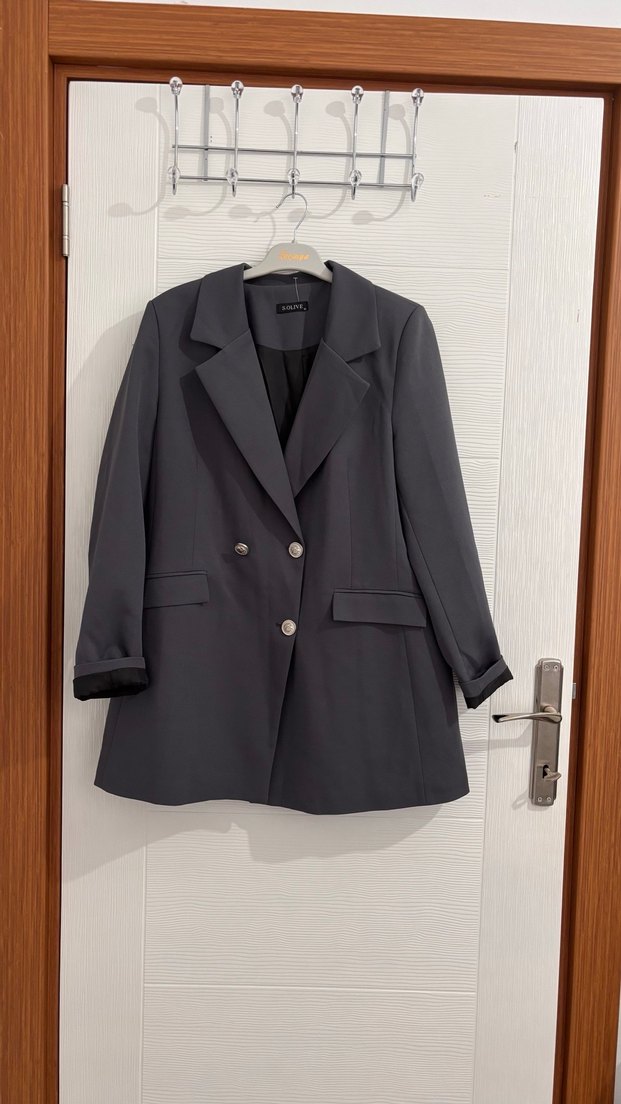 Gri renkli kadın blazer ceket, düğmeli ve kesimli yakaya sahip. Uzun kollu, midi boy ve rahat kesimdir. Ofis stiline uygundur. Boyu;81 cm