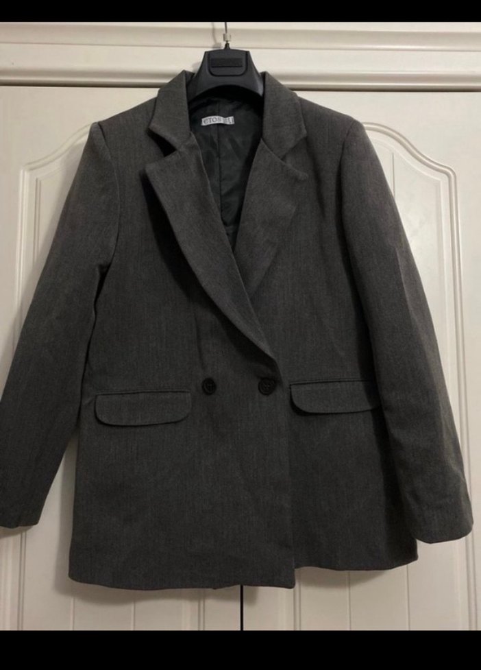 Gri renkli kadın blazer ceket, düğmeli ve kesik yakalıdır. Keten kumaştan, uzun kollu ve normal midi boydadır. Ofis ve günlük kullanıma uygundur.