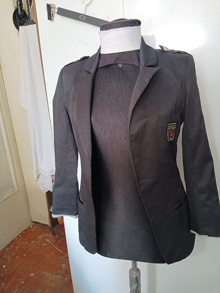 Düğmeli, gri renk kadın blazer ceket, notched yakalı ve uzun kolludur. Normal midi boyda, sentetik kumaştan üretilmiştir. Ofis için goth tarzı şıklık sunar.