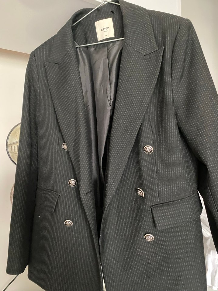 Düğmeli, yakalı kadın blazer ceket, normal uzunlukta, keten kumaştan, gri renkte, ofis ve iş ortamına uygun, rahat kesim ve askılı kollu.