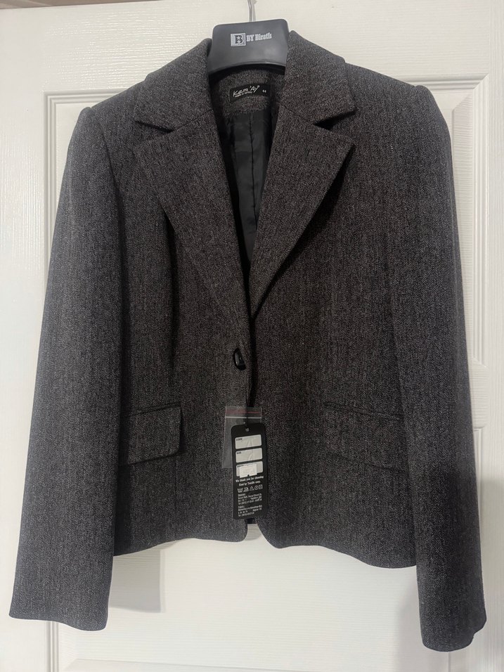 Gri yün blazer, düğmeli kapama, uzun kollu ve normal boyda, klasik iş tarzı için uygun bir kesime sahiptir.