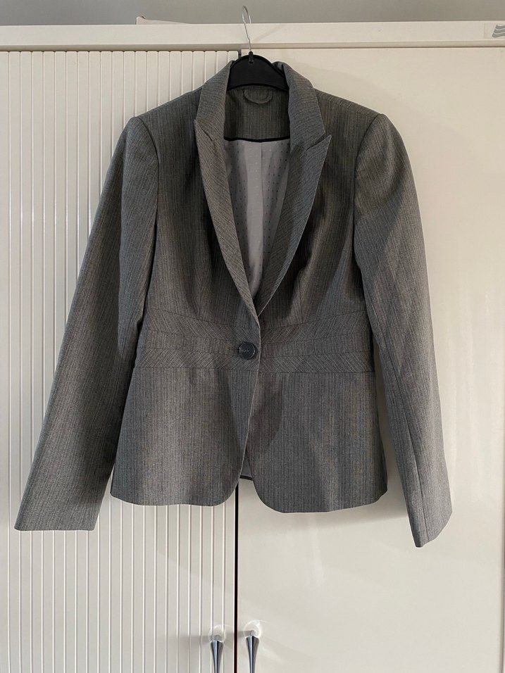 Gri renkli, düğmeli, uzun kollu kadın blazer ceket. Sentetik kumaştan, normal midi boyda, ofis için uygun modern klasik tarzda.