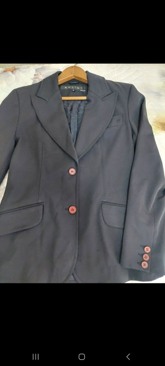 Gri renkli, düğmeli, uzun kollu kadın blazer ceket. Düz kesim, normal uzunluk ve notched yakaya sahip, ofis için uygun normcore tarzında.
