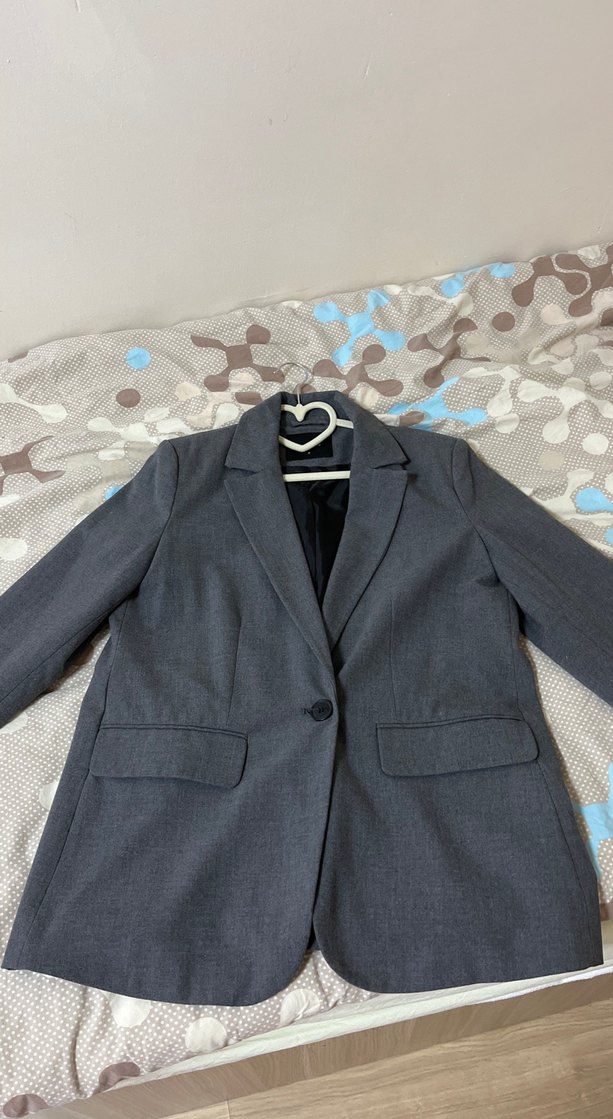 Düğmeli, gri renkli kadın blazer ceket, normal kesim ve uzun kollu. Sentetik kumaştan üretilmiş, iş ve günlük kullanım için uygundur.