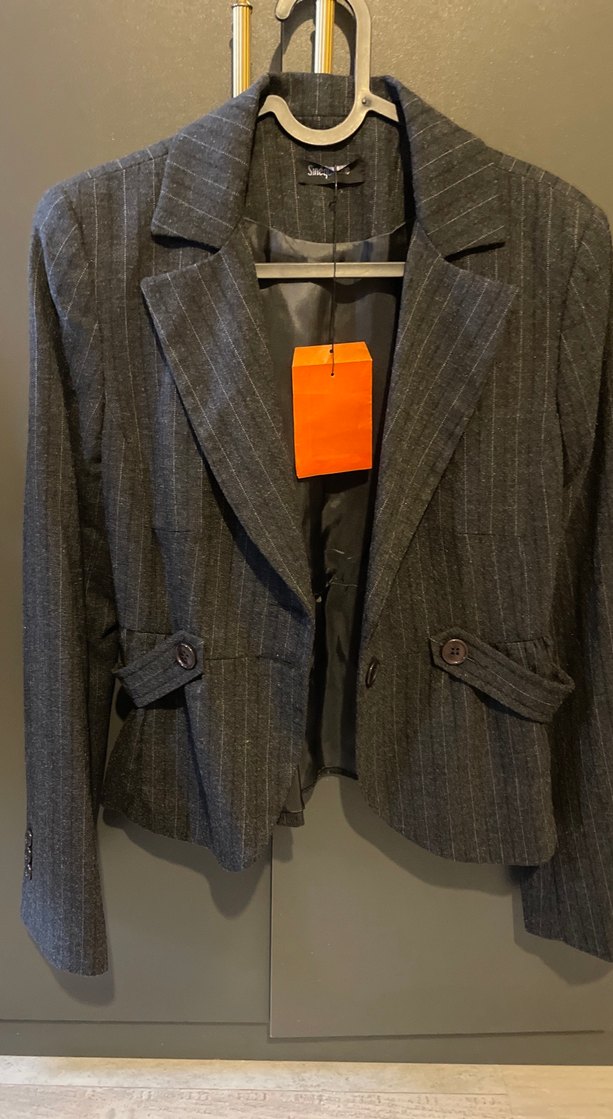 Düğmeli, yaka detaylı gri kadın blazer ceket, yün kumaştan ve baskılı desene sahip. Uzun kollu, normal kesim ve midi boydur. Boy 53 cm iki kol arası 43 cm