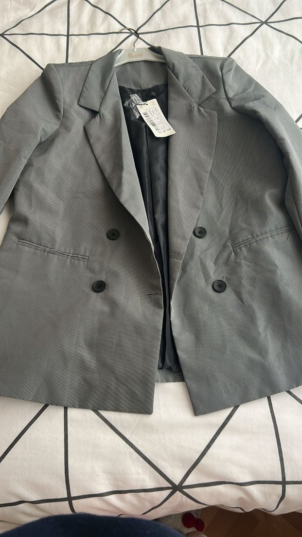 Beden olarak 40 yazıyor ama dar kalıp ondan 38 beden Düğmeli, gri renkte kadın blazer ceket, normal kesim ve midi boyda. Strappy kollu, notched yaka ve desensiz tasarıma sahip, ofis için uygun.
