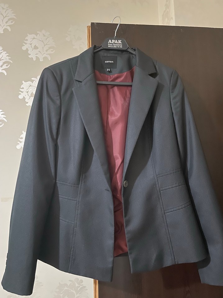 Düğmeli, dik yaka ve uzun kollu gri kadın blazer ceket, regular fit ve normal uzunluktadır. Sentetik kumaştan üretilmiş, modern klasik tarzda ofis kullanımı için uygundur. APAI etiketlidir.