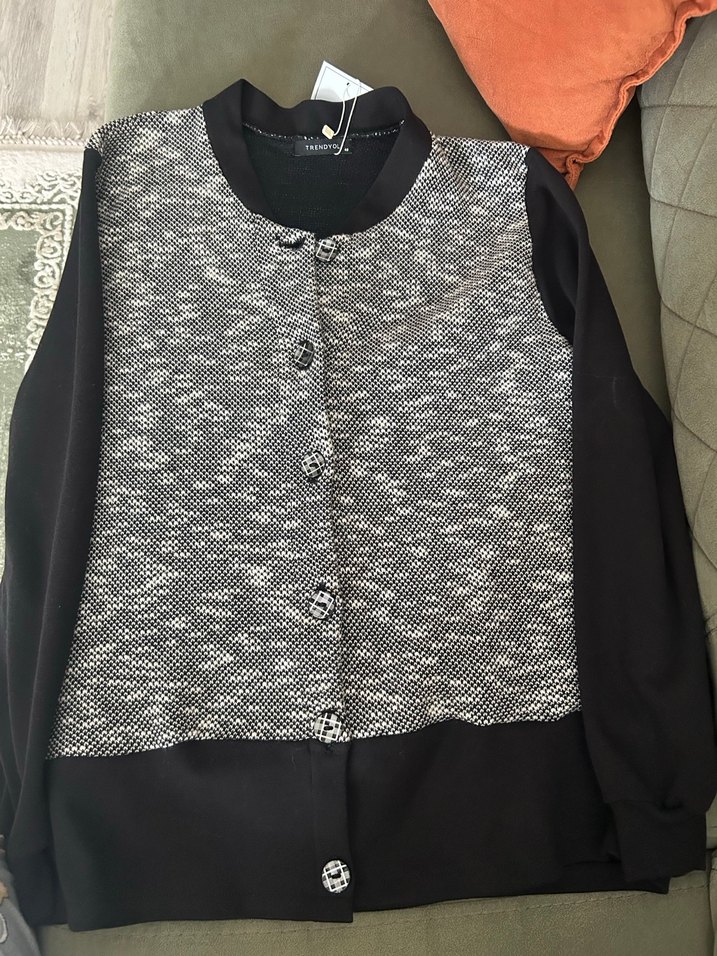 Düğmeli, uzun kollu ve yuvarlak yakalı, gri siyah renk kadın ceket. Normal uzunlukta, düzenli kesim ve dokulu ön panel içerir. Günlük kullanıma uygundur. İki Koltukaltı 56cm boyu 66cm. Etiketli ürün. Sorunsuzdur.