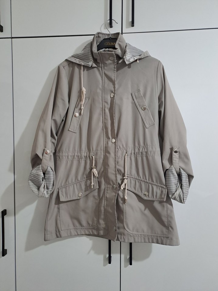 Gri renkli, düğmeli, keten kumaştan kadın ceket. Salaş kesim, yakalı ve askılı kollu. Normal midi boyda, desensiz, günlük sokak stili için uygun.