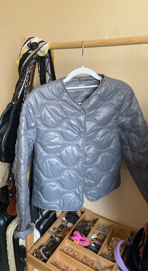 Düğmeli, kruvaze yakalı ve uzun kollu, yumuşak keten kumaştan yapılmış, gri renkli, vücuda oturan bir ceket. Günlük kullanıma uygun, rahat ve sokak stili.
