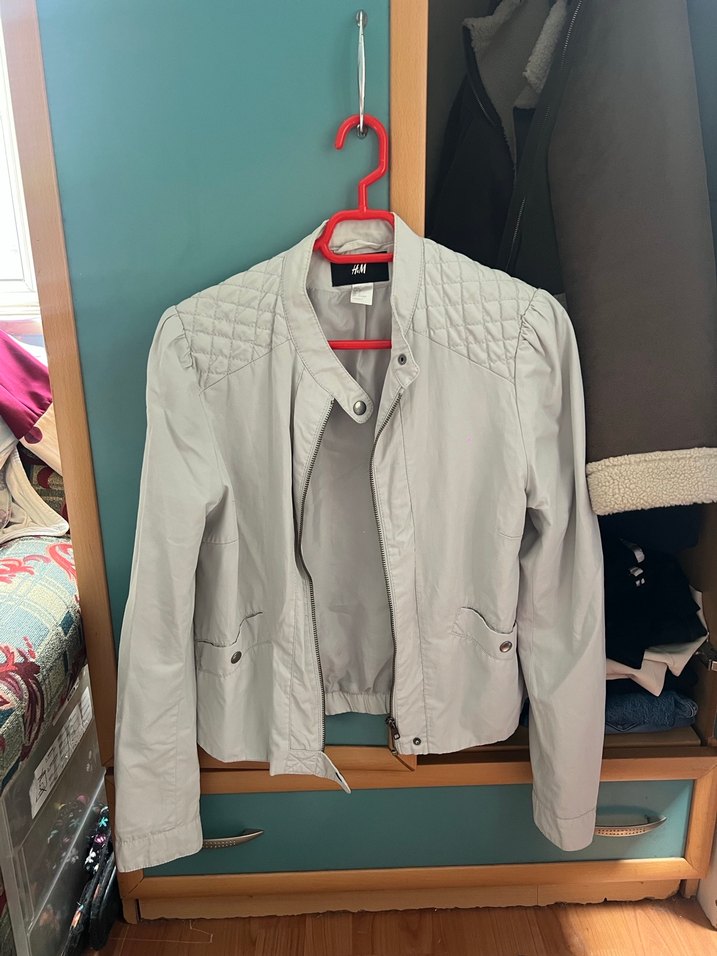 Düğmeli, normal boy gri kadın ceket, yakasında kesik detay ve uzun kollu. Keten kumaştan ve omuzlarda kapitone detaylı, günlük sokak tarzına uygun.