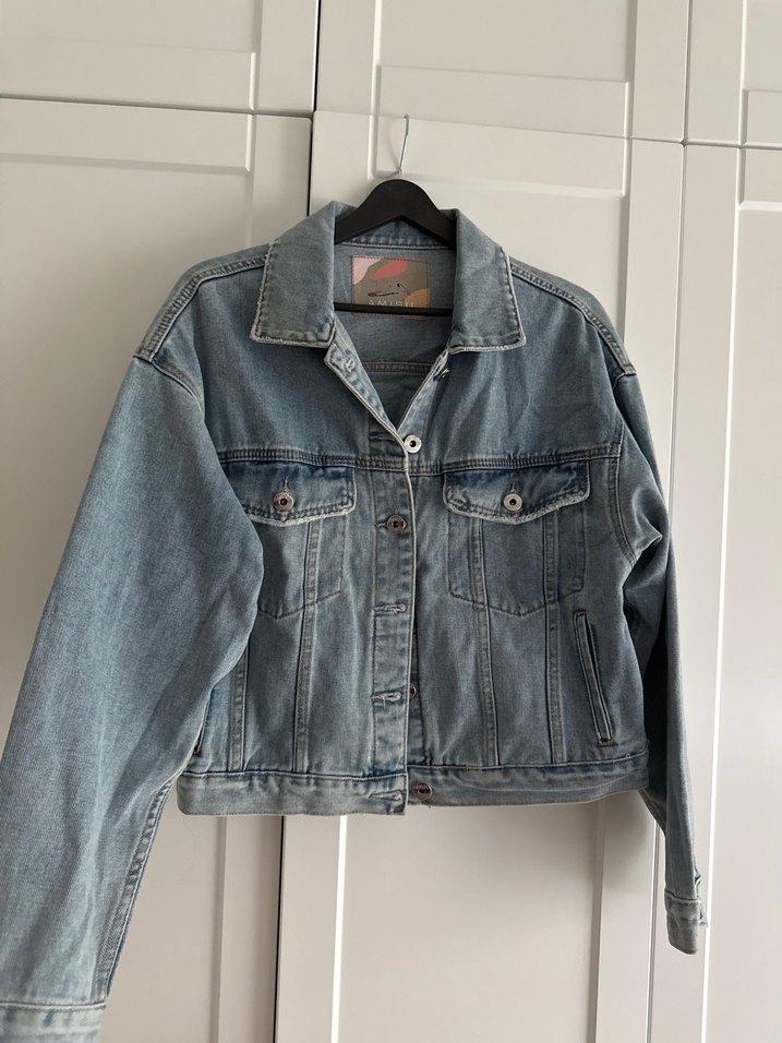 Bu gri denim ceket, uzun kollu ve düğmeli tasarımıyla rahat bir görünüm sunar. Notched lapel yaka ve bol kesimi günlük kullanım için uygundur. Iki koltuk arasi 49cm. Boy 52cm.