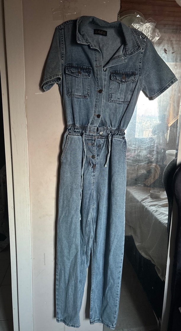 Gri denim kumaştan, düğmeli, bol kesim ve askılı kollu kadın ceket. Sivri yaka ve normal midi boyda, günlük kullanıma uygun.