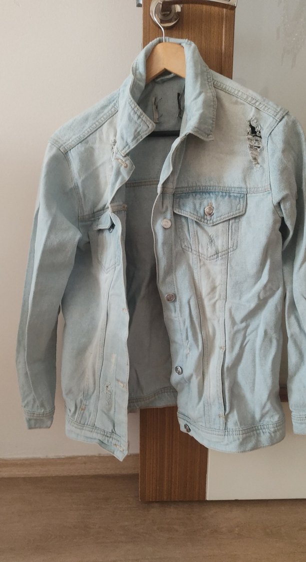 Gri renkte, düğmeli, notched lapel yakalı, bol kesim kadın denim ceket. Uzun kollu yırtık detaylı ve günlük kullanım için uygun, rahat sokak stili tarzında.