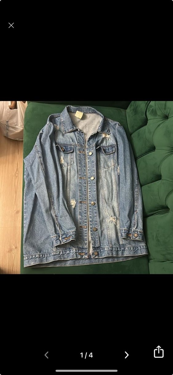 Düğmeli, geniş kesim, uzun kollu ve çıtçıtlı gri denim ceket. Notched lapel yakalı, günlük kullanım için uygun bir sokak stili ürünü.
