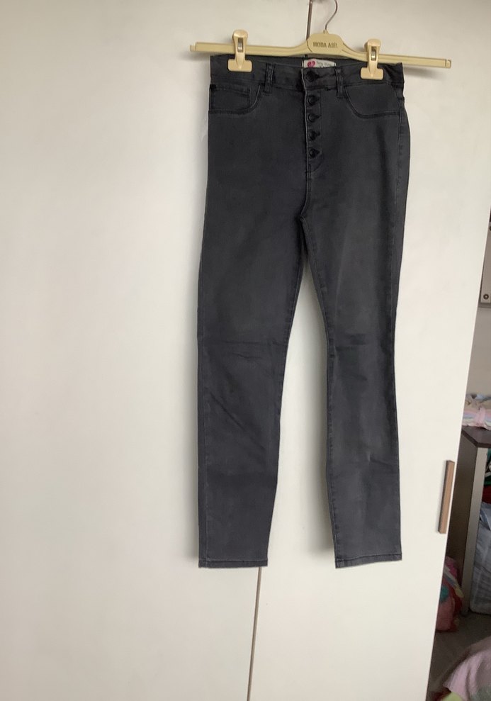 Düğmeli önde, gri renkte, midi boy ve regular fit kesime sahip kadın denim jean. Günlük rahat sokak stili için uygundur.
